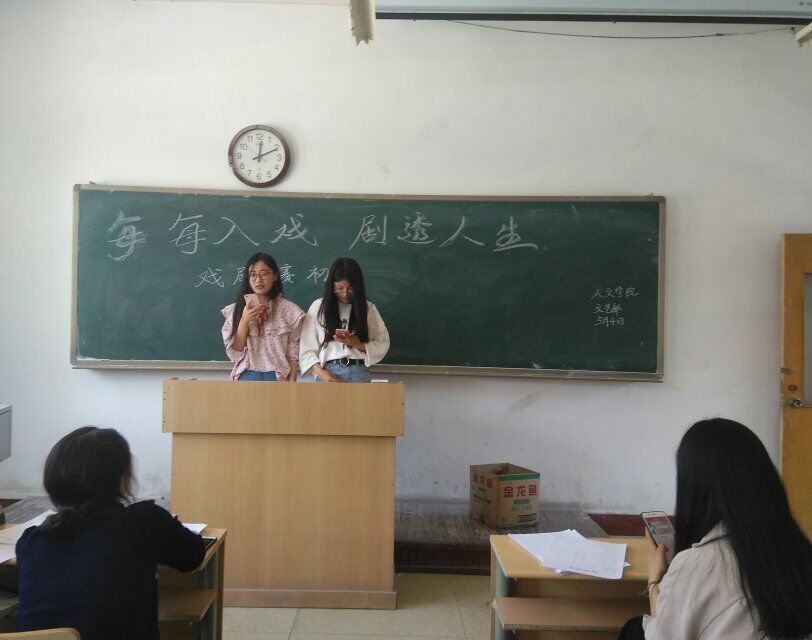 比赛开始后,参赛选手依次上台表演节目,丁雪和陈晓倩同学深情朗诵《我不停的更换驿马》,告诉我们什么是人生存在的真正价值,刘晓、弥燕飞、刘永翠、卢胜楠和任兰珍同学带来的小品《课间十分钟》,通过精彩的表演告诉我们要珍惜时间……参赛选手们各具特色,精彩演出赢得了阵阵掌声。经过激烈角逐,17语教2班的《课间十分钟》成功进入复赛。