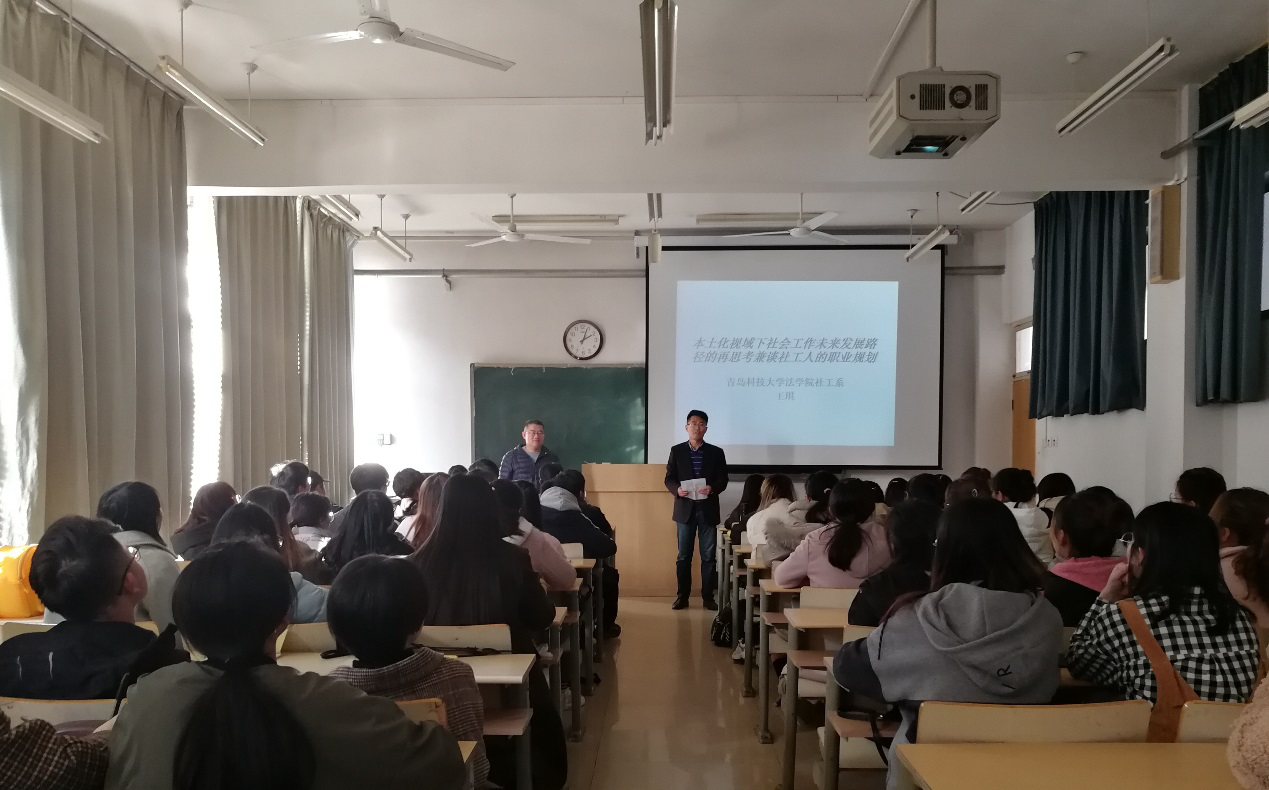王琪副教授的报告题目为《本土化视域下社会工作未来发展路径的再思考兼谈社工人的职业规划》。报告会上,王琪副教授从社会工作的发展历程、不同领域社会工作的发展、社工人的职业规划等几个方面进行了深入浅出的分析。他指出社会工作是现代社会结构不可或缺的重要组成部分,随着市场经济的进一步发展,将会发挥越来越重要的作用。报告会的最后,他从社会需求的角度,梳理了不同领域对社会工作人才需求的未来趋势,鼓励同学们认真学习,不断提高自身的专业水平。