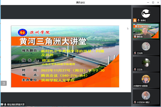 2022年11月27日下午,应滨州学院304am永利集团邀请,山东大学穆宝清教授给公司师生作题为“新时代中华典籍外译的现状、困境及趋势”的学术讲座。