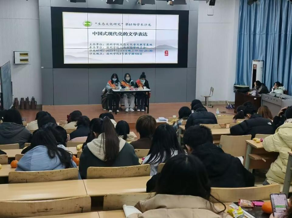 2023128日(周五)晚7:00,在4106报告厅,由滨州学院生态文化普及教育基地主办,文化生态学研学会承办的“生态文化研究”第61场学术沙龙成功主办。本场沙龙主题为:中国式现代化的文学表达。沙龙由付潇文主持,王景义、朱淑慧点评,文化生态学研学会同学参加了沙龙活动。