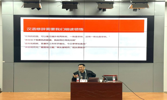 周志强教授主要是围绕修辞手法展开了此次讲座,他对修辞手法提出了有别书面定义的独到见解。周志强教授认为修辞手法应该是从广义方面来说的,包含着许多内容,语气、说话方式、咬文嚼字等都与修辞手法有着密不可分的联系。讲座中周志强教授以文学作品为例,分析文学语言中所蕴含的表面意思和曲折意思,进一步展现文学语言的多样性和修辞表现的魅力。