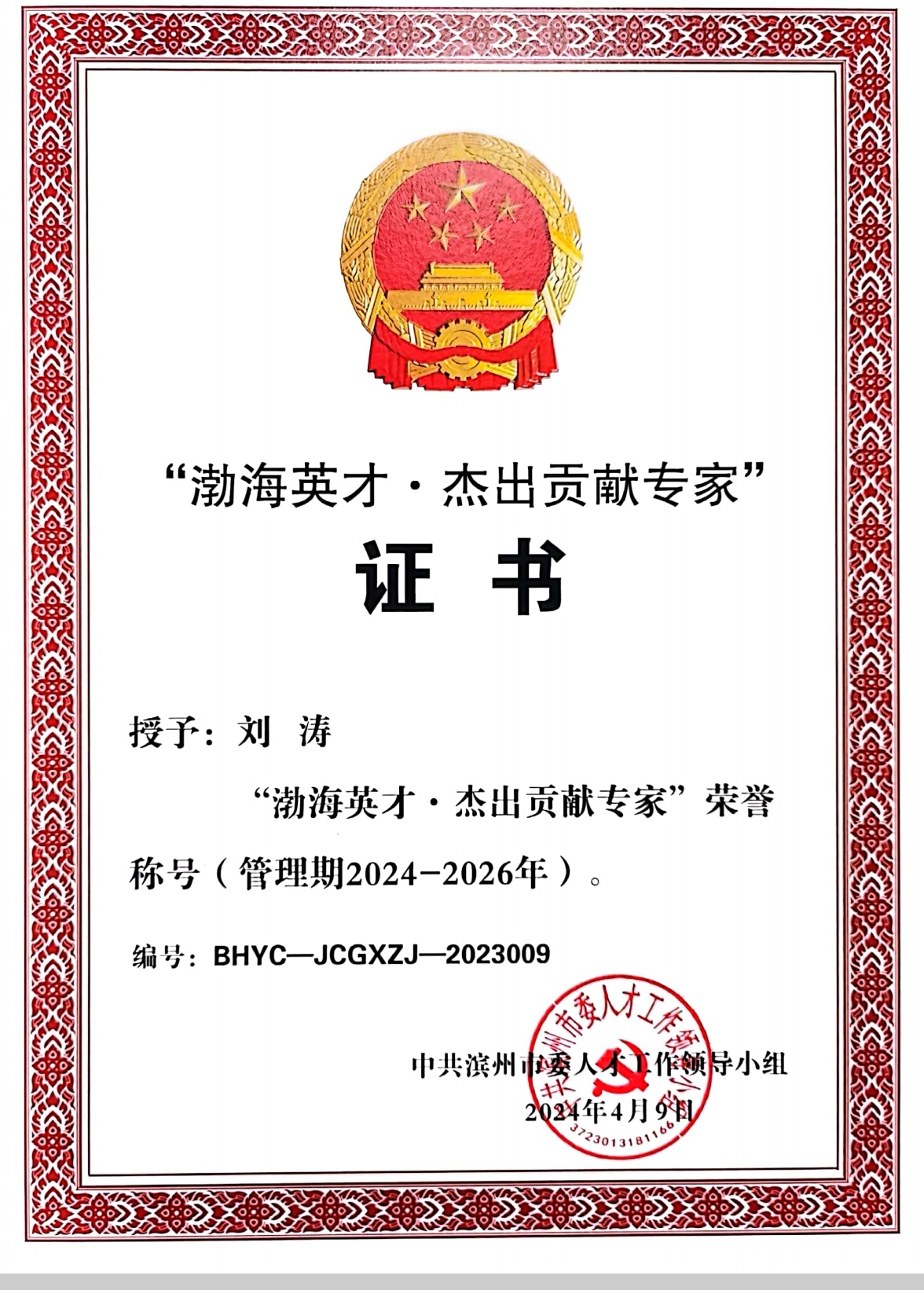 “渤海英才•杰出贡献专家”是市级最高层次人才称号,重点表彰在相关领域取得重大成绩、重大创新成果,或具有特殊技能和社会重大影响,作出杰出贡献,经济效益和社会效益显著的国内外高层次人才。此次“渤海英才•杰出贡献专家”荣誉的获得,对助推公司人才队伍建设取得新成就,激励更多优秀人才投身滨州地方建设和发展具有重要意义。
