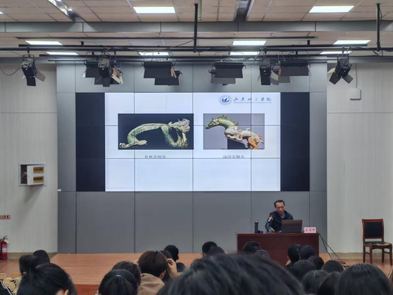 在讲座中,王老师首先引用闻一多先生的评价介绍了先秦龙形象由单一的复杂的的演变,然后,以先秦时期龙形象的考古发现生动介绍了先秦时期人们对龙的崇拜。他指出,先秦考古中发现的龙形象对于研究我国古代历史文化具有重要的学术意义。一方面,龙形象是研究古代宗教信仰、社会制度、艺术审美等方面的重要资料;另一方面,龙形象的演变过程反映了我国古代社会的变迁和发展。王老师的阐释帮助同学们更加充分地了解了先秦时期的龙形象,为我们揭示了龙形象在我国历史文化中的独特地位和丰富内涵,这对于我们更好地认识我国古代历史文化,传承和弘扬中华民族优秀传统具有积极的意义。