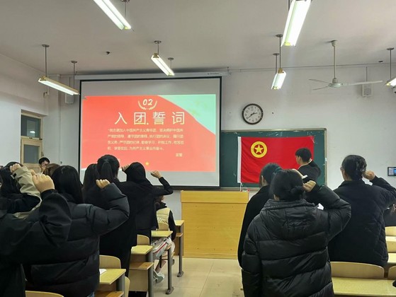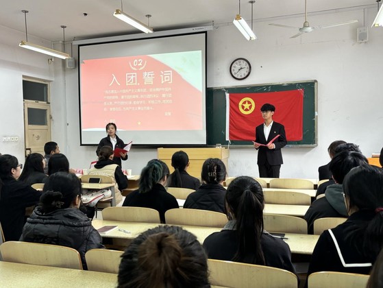 会议伊始,全体成员起立,奏唱国歌,嘹亮的国歌声在教室里回荡,为整个仪式拉开序幕。而后由辅导员老师说明举行入团仪式的意义,宣布新团员名单,并请老团员代表向新团员颁发团员证、佩戴团徽。大家面对庄严的团旗进行宣誓,铿锵的誓词象征着新团员对共青团组织的忠诚和归属。随后新团员代表进行发言,号召同学们认真履行团员义务,遵守团的纪律,充分发挥团员模范带头作用。大家认真聆听入团介绍人宣读《团章》中有关团员的义务和权利的条款。会议最后,学院团总支书记勉励各位青年团员要坚定共产主义理想信念,永葆入团初心,能吃苦、肯奋斗,为共产主义事业而奋斗。青年团员们听后备受鼓舞,立志要成为一名优秀的中国共产主义青年团团员。